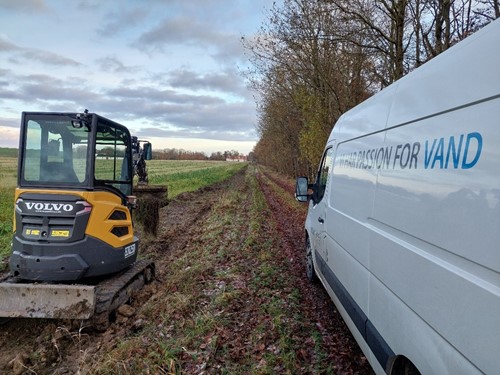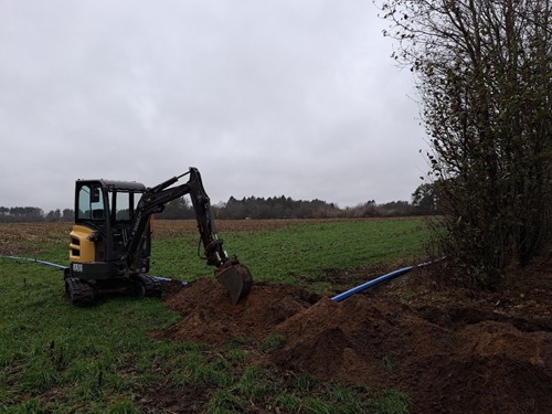 I forbindelse med den kommende fusion mellem Selkær Mølle Vandværk og Vandcenter Djurs er vi langt med at etablere den ca. 1,6 km lange forsyningsledning, der skal forbinde Selkær Mølle med vandværket i Sostrup. Her den 1. december mangler vi cirka 350 m ledning, samt etablering af sektionsbrønden, hvor tilslutningen til Selkær Mølles ledningsnet sker.